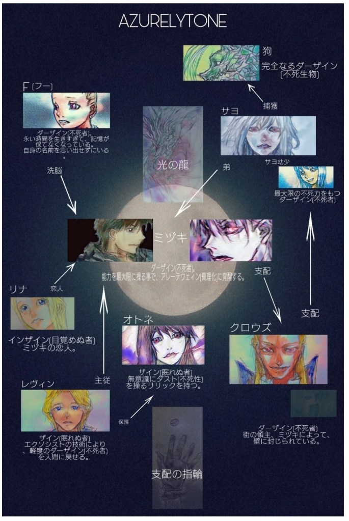 小説AZURELYTONE(アズレリイトオン) 登場人物紹介です。 相関図 登場人物名称 ミヅキ f(フー) メスメル=レヴィン オトネ サヨ クロウズ ストーリー本編はこちらから 共有: クリックして X で共有 (新しいウィンドウで開きます) X Facebook で共有するにはクリックしてください (新しいウィンドウで開きます) Facebook クリックして WhatsApp で共有 (新しいウィンドウで開きます) WhatsApp クリックして Pinterest で共有 (新しいウィンドウで開きます) Pinterest クリックして友達にメールでリンクを送信 (新しいウィンドウで開きます) メールアドレス その他 クリックして LinkedIn で共有 (新しいウィンドウで開きます) LinkedIn クリックして Reddit で共有 (新しいウィンドウで開きます) Reddit クリックして Tumblr で共有 (新しいウィンドウで開きます) Tumblr クリックして Pocket でシェア (新しいウィンドウで開きます) Pocket クリックして Telegram で共有 (新しいウィンドウで開きます) Telegram いいね 読み込み中… 投稿者: Azu イラストとストーリーのサイトです。 世の中の物事や、心の模様を、独自のイメージで例えたり表現します。 Azu の投稿をすべて表示