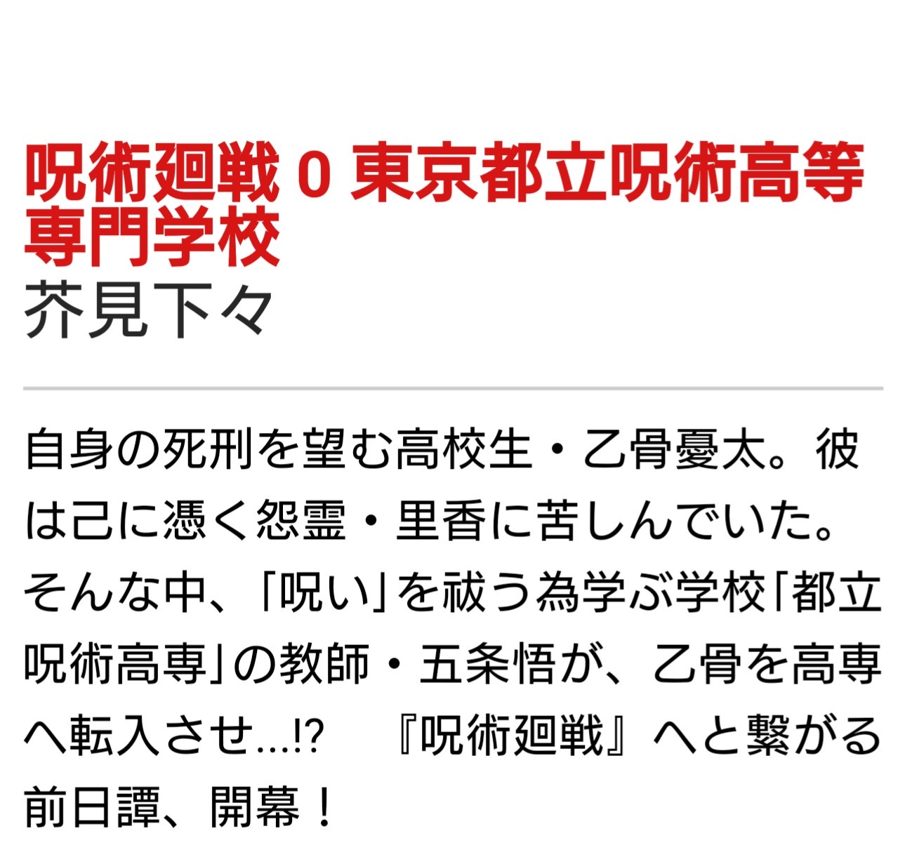 〔shonenjump.com〕 〔shonenjump.com〕 呪術廻戦は、虎杖悠仁(イタドリユウジ) を主人公とした物語だが 悠仁、同じ高校の一年先輩の乙骨憂太(オコツユウタ)の物語。 すごい事に、読み切りで発表されたシリーズらしいが、設定にブレが全くない。 ↓試し読みはこちら ➡️呪術廻戦 0巻 共有: クリックして X で共有 (新しいウィンドウで開きます) X Facebook で共有するにはクリックしてください (新しいウィンドウで開きます) Facebook クリックして WhatsApp で共有 (新しいウィンドウで開きます) WhatsApp クリックして Pinterest で共有 (新しいウィンドウで開きます) Pinterest クリックして友達にメールでリンクを送信 (新しいウィンドウで開きます) メールアドレス その他 クリックして LinkedIn で共有 (新しいウィンドウで開きます) LinkedIn クリックして Reddit で共有 (新しいウィンドウで開きます) Reddit クリックして Tumblr で共有 (新しいウィンドウで開きます) Tumblr クリックして Pocket でシェア (新しいウィンドウで開きます) Pocket クリックして Telegram で共有 (新しいウィンドウで開きます) Telegram いいね 読み込み中… 投稿者: Azu イラストとストーリーのサイトです。 世の中の物事や、心の模様を、独自のイメージで例えたり表現します。 Azu の投稿をすべて表示