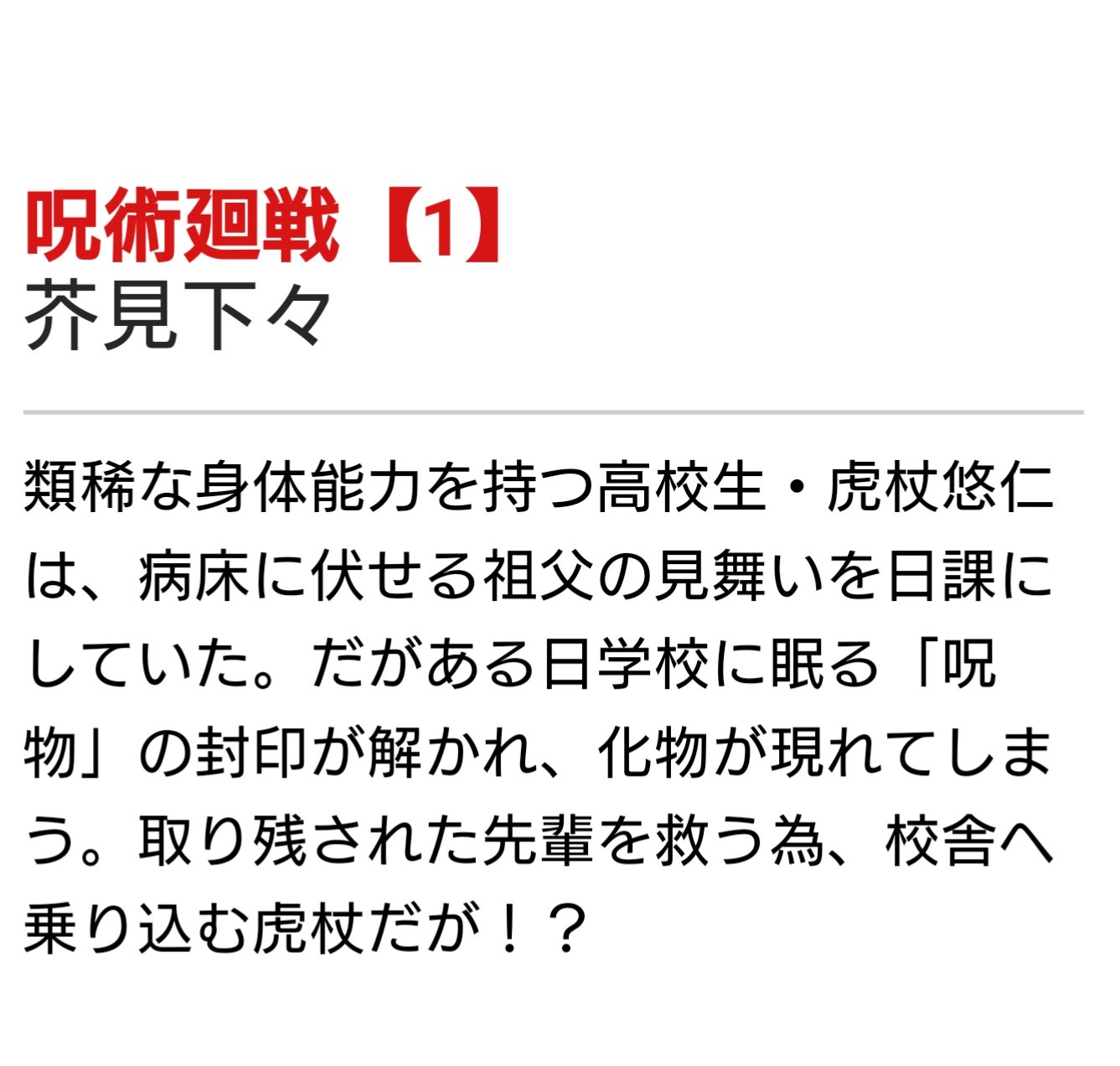 〔shonenjump.com〕 〔shonenjump.com〕 主人公、虎杖悠仁 ( イタドリユウジ) のサッパリした性格のおかげで世界設定もサクサク受け入れてくれる。 設定に対する戸惑いがないので、登場人物達の能力比べを純粋に楽しめる。 アニメ版はこちら↓ 〔amazon.co.jp〕 呪術廻戦 エピソード1~4 共有: クリックして X で共有 (新しいウィンドウで開きます) X Facebook で共有するにはクリックしてください (新しいウィンドウで開きます) Facebook クリックして WhatsApp で共有 (新しいウィンドウで開きます) WhatsApp クリックして Pinterest で共有 (新しいウィンドウで開きます) Pinterest クリックして友達にメールでリンクを送信 (新しいウィンドウで開きます) メールアドレス その他 クリックして LinkedIn で共有 (新しいウィンドウで開きます) LinkedIn クリックして Reddit で共有 (新しいウィンドウで開きます) Reddit クリックして Tumblr で共有 (新しいウィンドウで開きます) Tumblr クリックして Pocket でシェア (新しいウィンドウで開きます) Pocket クリックして Telegram で共有 (新しいウィンドウで開きます) Telegram いいね 読み込み中… 投稿者: Azu イラストとストーリーのサイトです。 世の中の物事や、心の模様を、独自のイメージで例えたり表現します。 Azu の投稿をすべて表示
