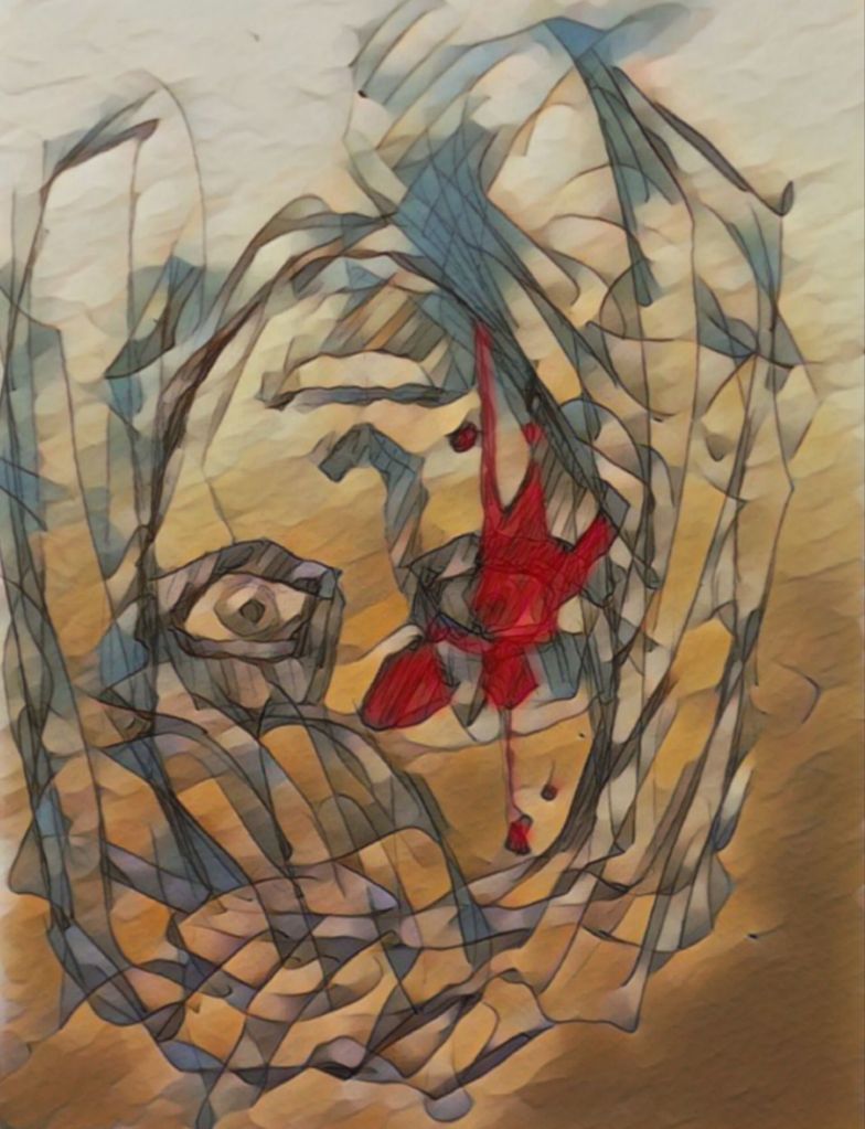 (ドアに彫刻された妖精だ……返り血?……いや、わざと目にぬられている)